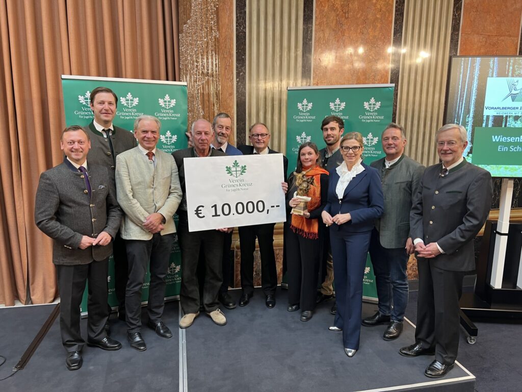 Das Projekt „Wiesenbrüterschutz im Vorarlberger Rheintal“ wurde mit dem Biodiversitätspreis 2025 des Vereins Grünes Kreuz ausgezeichnet. Die feierliche Preisverleihung fand im österreichischen Parlament in Wien statt. Die Trophäe sowie das Preisgeld in Höhe von 10.000 Euro wurden von Dr. Christa Kummer, Präsidentin des Vereins Grünes Kreuz, an die Projektverantwortlichen überreicht
